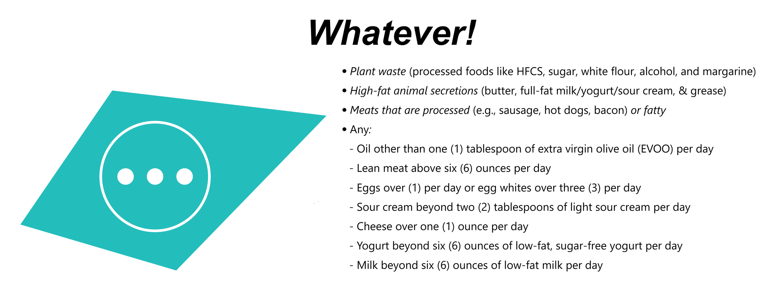 The Whatever! section includes…to repeat, WHATEVER!, but generally refers to anything that is more counterproductive than not to our goals of health and/or weight loss:
